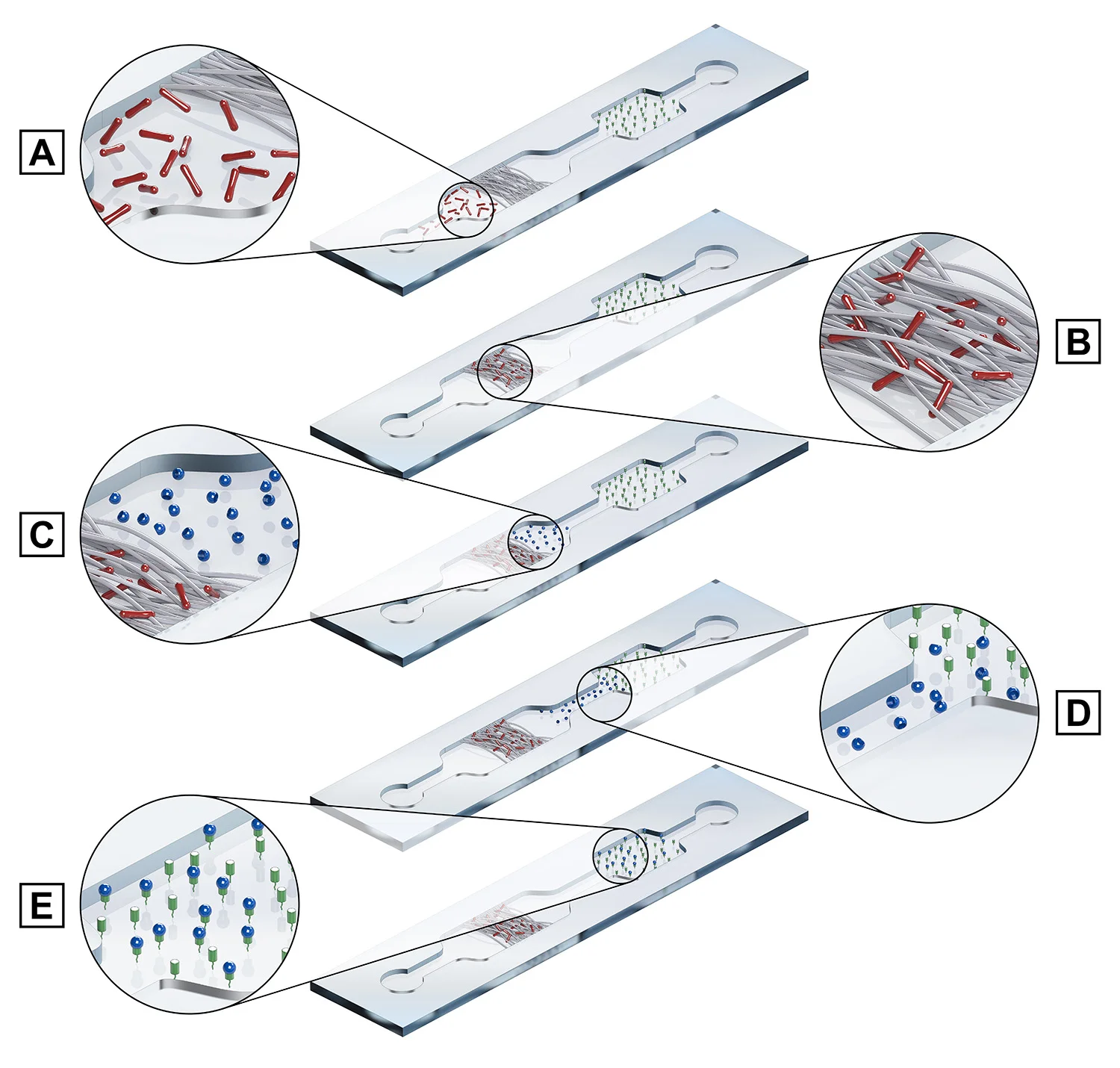 PDMS is expensive and impractical for industrial use, despite the ease with which it can be used to create microchannels using an Si or metal template. At my appointments at both the Cornell University and University of Regensburg biosensor labs, I instead use PMMA (acrylic glass/Plexiglas®)—which I pattern by hot embossing with the same Si/metal templates used for PDMS soft lithography—to create microfluidic channels that are sturdier, more pressure-resistant, less absorbent, and less expensive than PDMS-based alternatives. A sample application is shown in the figure above, in which PMMA fabrication allows us to embed nanofibers into our microchannels for analyte capture (E. coli in this case), after which the captured target expresses disease/virulence factors that are captured downstream with bioreceptors capable of transducing their binding events optically (e.g. via competitive binding with a fluorophore) or electrochemically.