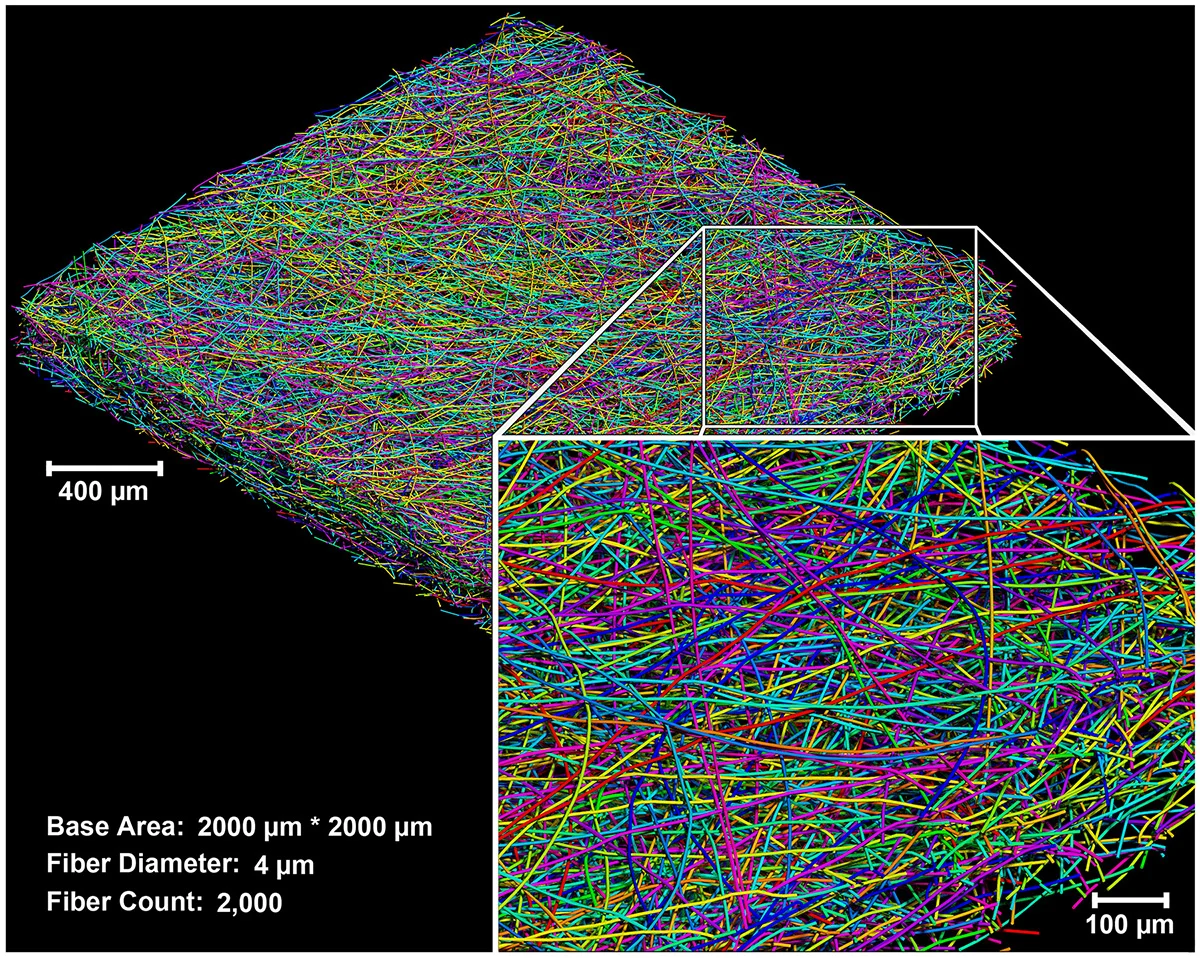 In 2013, and for the last 3 months of 2015, I developed an explicit dynamics model of nanofiber deposition during the electrospinning process, in order to overcome limitations in geometric accuracy inherent to the stochastic models used by industrial software such as GeoDict. The solver, implemented in MATLAB and C++, can simulate fiber volumes over 1,000 times larger than existing commercial solutions within just a few hours, and produces accurate anisotropy, pore size distributions, solid volume fractions, and pressure drops. I generate CFD-ready geometry from completed fiber-deposition simulations either parametrically by automating thousands of circular sweeps along fiber-defined splines with AutoLISP scripting in AutoCAD, or by exporting the data as voxels (image slices packaged in a DICOM file via an ImageJ plugin I wrote) and performing image-based meshing. I then use this geometry to create or refine a finite-volume mesh in ICEM and subsequently perform, with ANSYS Fluent, CFD analyses of dissolved-species dispersion and solution mixing in the mat, or of particulate impaction and caking.