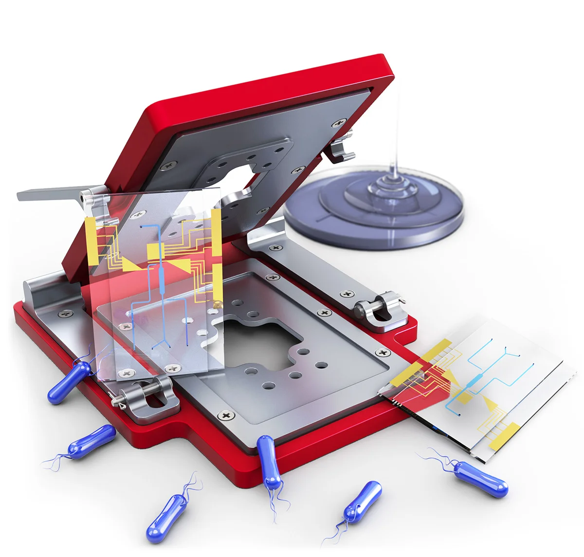 In 2015, I designed an easily machinable chip holder with 10 fluidic and 6 electric connections for quickly interfacing syringe-pump tubing and potentiostats to microfluidic channels. 'Nanoports' and similar single-use, glue-down connections become unfeasible when a large number of chips must be tested, and a chip holder like the one pictured permits rapid chip swapping through a zero-dead-volume connection by using PDMS ferrules (which I also cast in-house with custom molds). The chip holder is compatible with both bonded PMMA-PMMA channels (those two in the foreground) as well as with PDMS-glass channels (the casting of which is shown in the background). Lastly, the metal chip holder is compatible with harsh autoclaving/sterilization processes to remove contaminants such as the not-quite-to-scale blue bacteria pictured above.